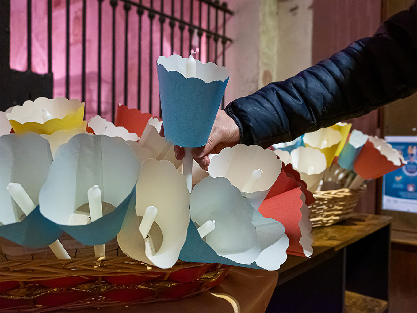 Una mano prende una candela, una delle tante, non importa quale, è da accendere ed é questo il particolare che da senso al gesto apparentemente insignificante.